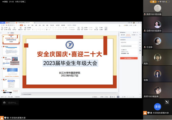 为确保学生国庆期间以及在校期间安全,严防各类事故发生,牢牢守住安全底线,迎接党的二十大胜利召开。9月27日,完美电竞组织本科生及研究生各班召开“安全庆国庆·喜迎二十大”主题班会,会议采用线上线下结合模式。班会围绕疫情防控、防诈骗教育、防溺水安全教育三个方面展开。